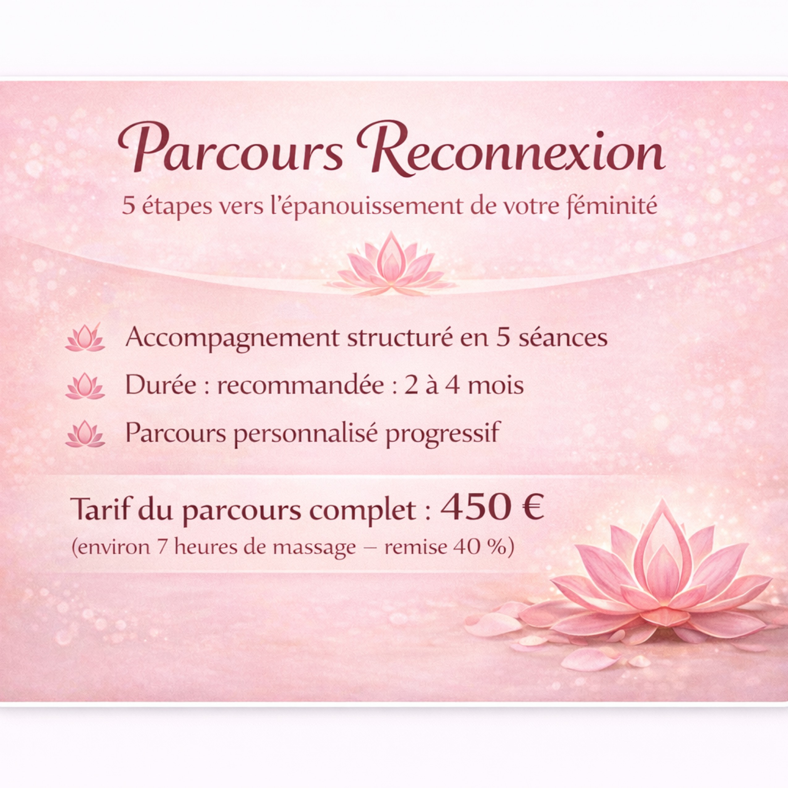 Ce parcours en 5 étapes s’adresse aux femmes qui souhaitent aller au‑delà d’une simple détente et s’engager dans une exploration profonde : reconnaître leur corps, libérer ce qui est resté figé, réveiller leur énergie vitale et retrouver une sensualité sereine, puissante et respectueuse d’elles‑mêmes.